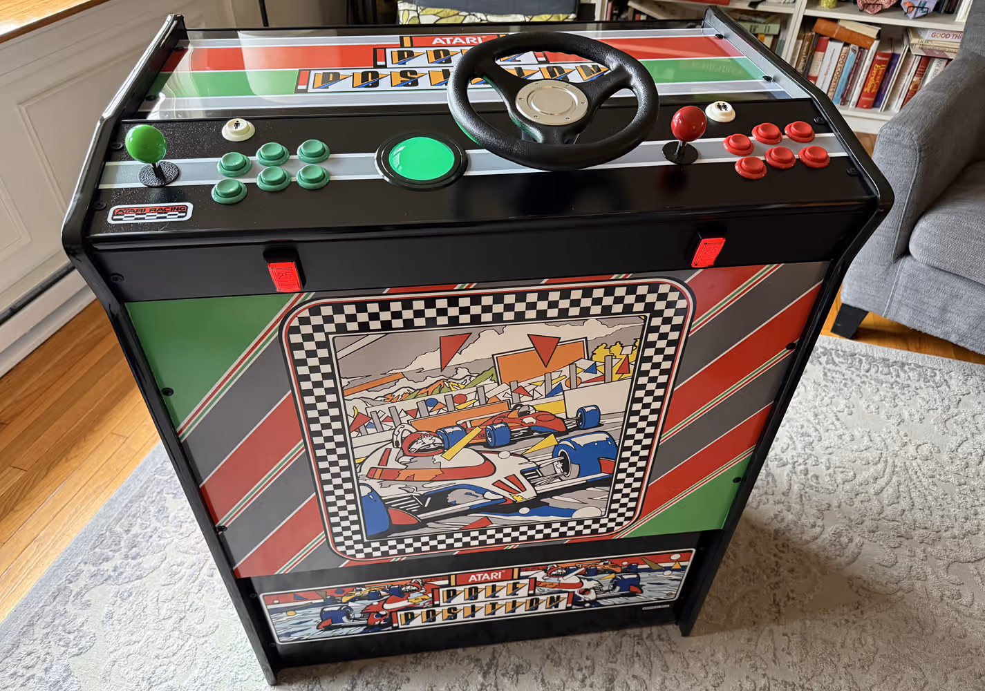 Features a custom control panel with wheel, custom pedals, trackball, custom Pole Position graphics